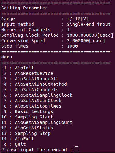 - To perform data acquisition processing again, select the command [1 : AioInit] and specify a new device name to perform device initialization processing.