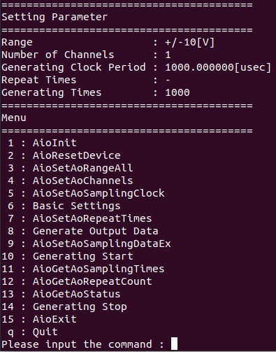 - To output data again, select the command [1 : AioInit] and specify a new device name to perform device initialization processing.