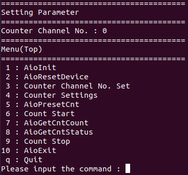 - To perform data acquisition processing again, select the command [1 : AioInit] and specify a new device name to perform device initialization processing.