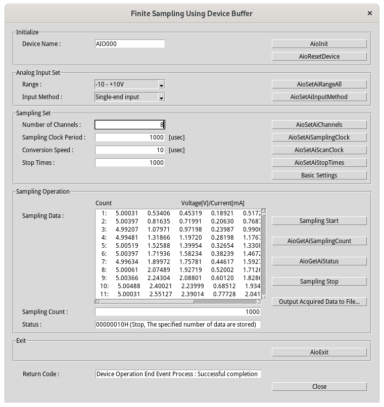 ・Press the [AioGetAiSamplingCount] button to update the displayed value of [Sampling Count:].