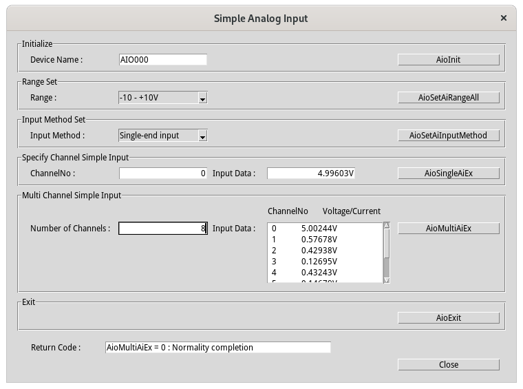 Enter the desired number of channels in [Number of Channels:] in the Multi Channel Simple Input frame, and press the [AioMultiAiEx] button.
