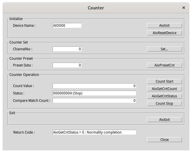 ・When you press the [AioGetCntCount] button, the displayed value of [Count Value:] is updated.