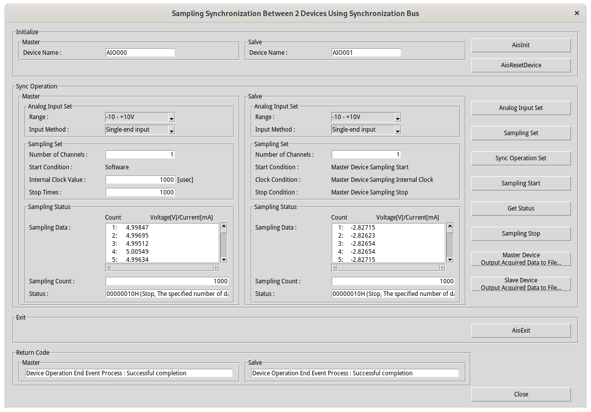 ・By pressing the [Master Device Output Acquired Data to File...] button, you can save the sampling data displayed in the master side text box to a text file.