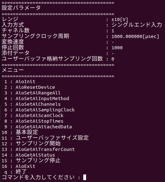 サンプリングクロック周期を指定するとAioSetAiSamplingClockが実行され、CUIメニューが再度表示されます。