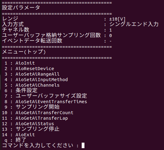 希望するサンプリング回数を入力するとAioSetAiEventSamplingTimesが実行され、CUIメニューが再度表示されます。