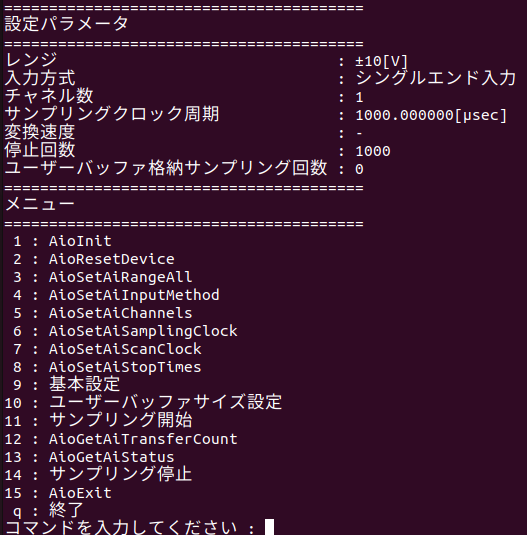 サンプリングクロック周期を指定するとAioSetAiSamplingClockが実行され、CUIメニューが再度表示されます。