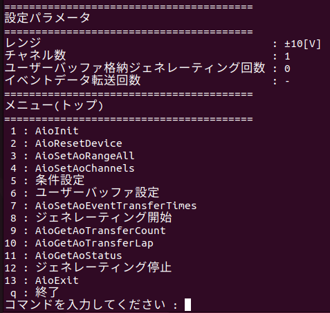 チャネル数を指定するとAioSetAoChannelsが実行され、CUIメニューが再度表示されます。