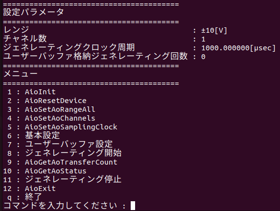 ジェネレーティングクロック周期を指定するとAioSetAoSamplingClockが実行され、CUIメニューが再度表示されます。