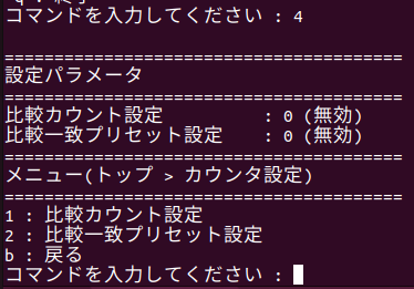 ・カウンタ設定メニューから「b : 戻る」を選択すると、トップメニューへ戻ります。