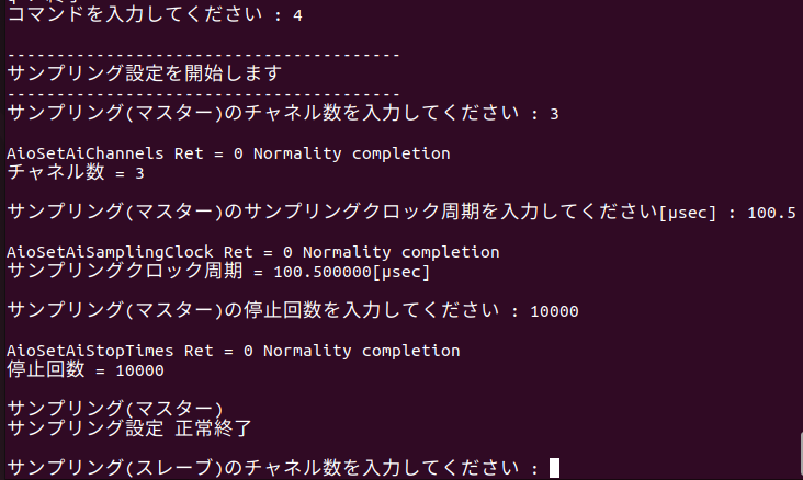 ・[4 : サンプリング設定]をコマンド選択すると、サンプリング(マスター)のチャネル数、サンプリングクロック周期、停止回数を指定できます。