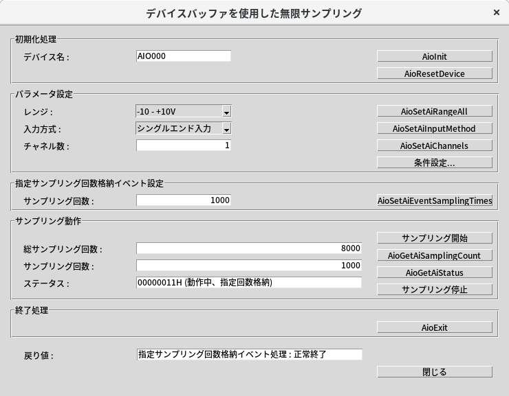 再び、データ取得処理を行う場合は、新たなデバイス名を指定の上、[AioInit]ボタンを押し、デバイス初期化処理を行ってください。