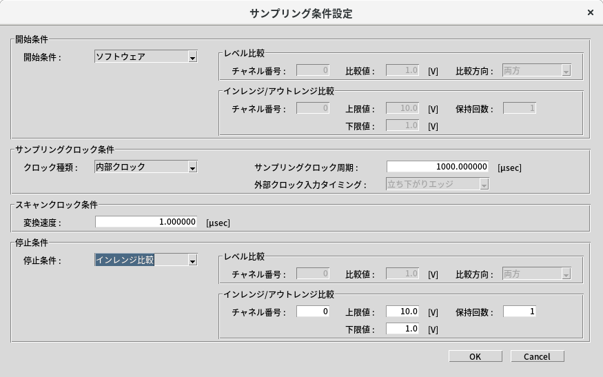内部クロックを選択した場合、サンプリングクロック周期を[μsec]単位で入力しします。指定できるサンプリングクロック周期の最小値は、利用するデバイスによって異なります。