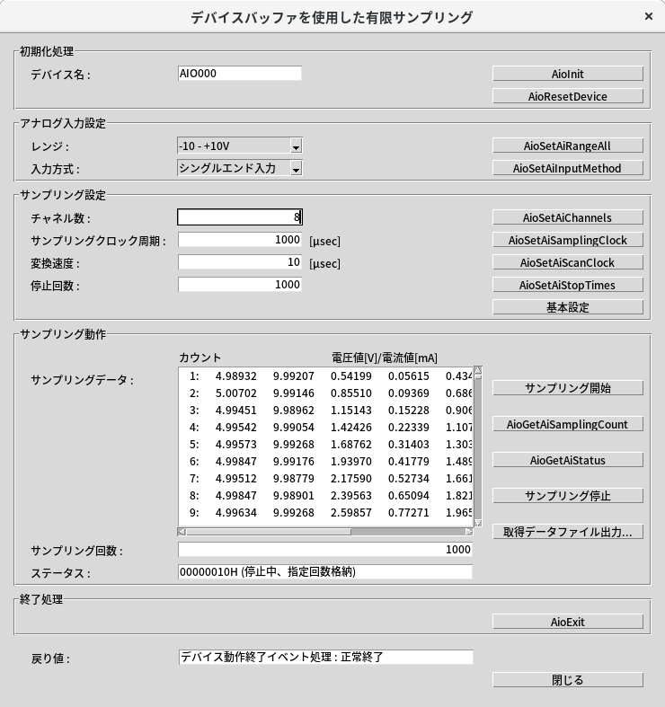 再び、データ取得処理を行う場合は、新たなデバイス名を指定の上、[AioInit]ボタンを押し、デバイス初期化処理を行ってください。