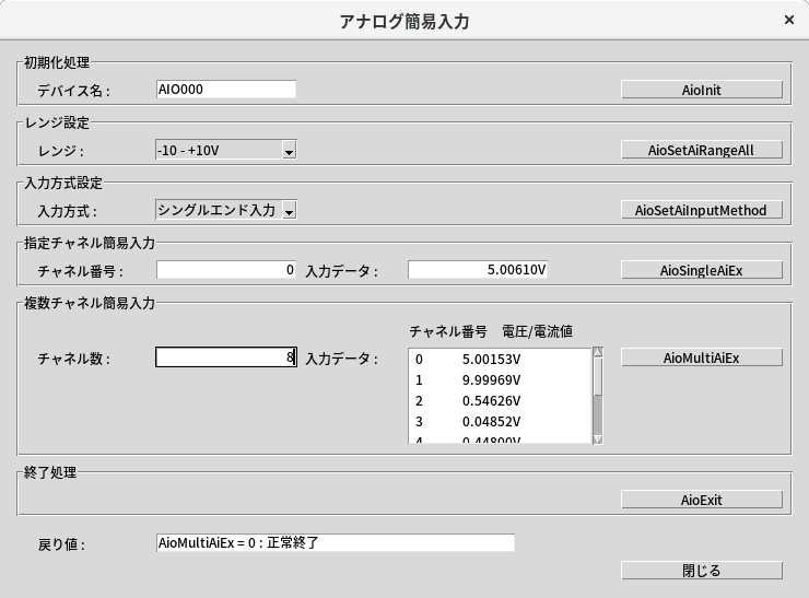 再び、データ取得処理を行う場合は、新たなデバイス名を指定の上、[AioInit]ボタンを押し、デバイス初期化処理を行ってください。