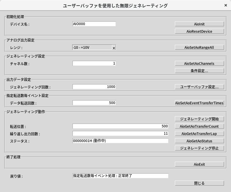 再び、データ出力処理を行う場合は、新たなデバイス名を指定の上、[AioInit]ボタンを押し、デバイス初期化処理を行ってください。