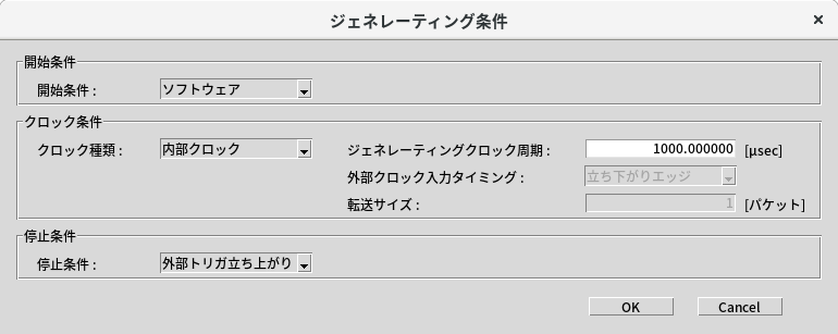 内部クロックを選択した場合、ジェネレーティングクロック周期を[μsec]単位で入力しします。指定できるジェネレーティングクロック周期の最小値は、利用するデバイスによって異なります。