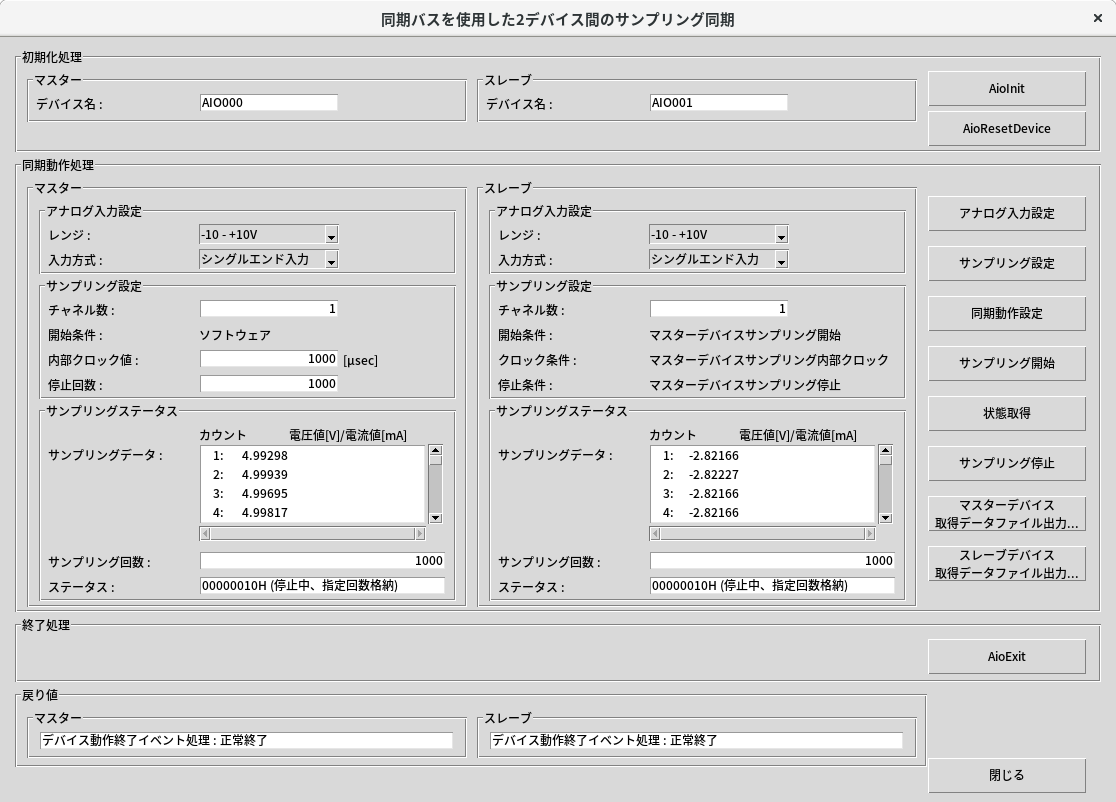 このサンプルプログラムは、同期バスを使用するため、同期コネクタを持っているデバイスの選定が必要です。