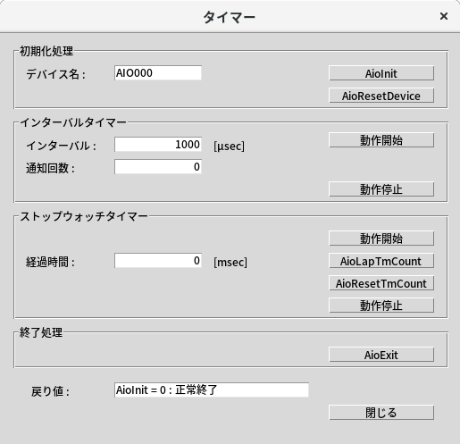 ・[AioResetTmCount]ボタンを押すと、経過時間がリセットされます。