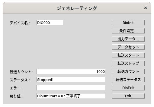 設定ツールで設定したデバイス名を指定し、[DioInit]ボタンを押します。