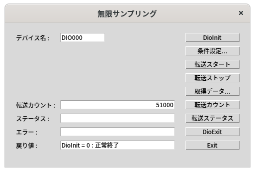 設定ツールで設定したデバイス名を指定し、[DioInit]ボタンを押します。