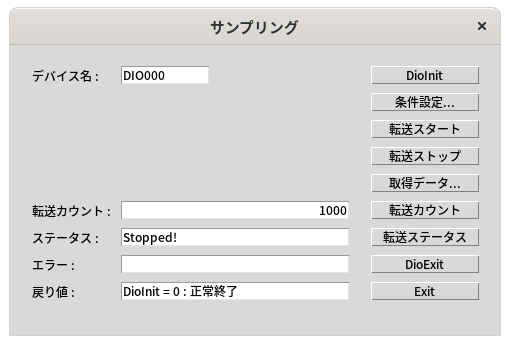 設定ツールで設定したデバイス名を指定し、[DioInit]ボタンを押します。