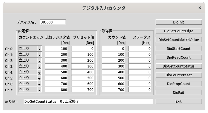 ステータスの内容につきましては、DioGetCountStatus を参照してください。