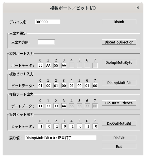 複数入力のテストを行うにはDioInpMultiByte、DioInpMultiBitを実行します。