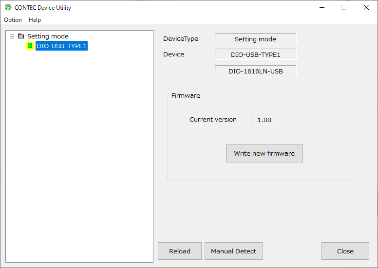 3. When this device is detected with the Module ID "F:F", "DIO-USB-TYPE1" is displayed in the "Setting mode" tree.