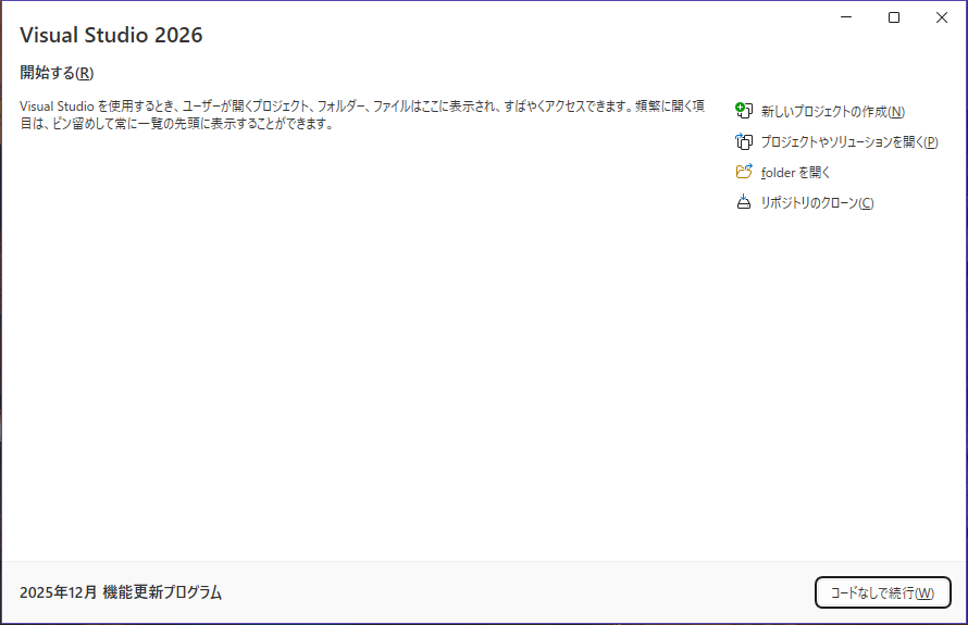 画面上の「コードなしで続行(W)」を選択すると、ウィザードが停まりVisual Studioのメニューバーが表示されます。