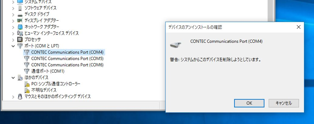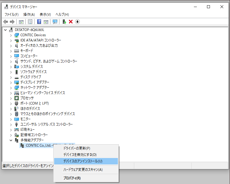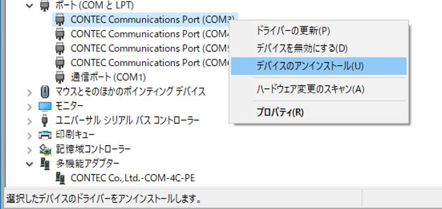 ⑩ デバイスマネージャー内の「多機能アダプター」配下の実装デバイス名、および、「ポート(COMとLPT)」配下のCOMポートが削除されていることを確認してください。