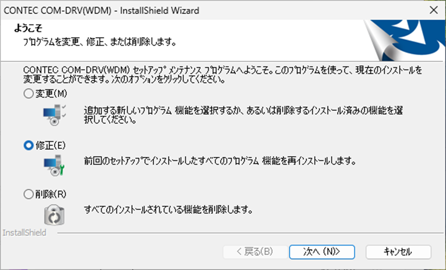 1.「ようこそ」ダイアログから、[修正(E)]を選択し、[次へ (n) >]をクリックします。
