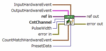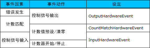 例如,当在计数匹配的定时输出控制信号(单次脉冲), 同时将计数值清零时,设定OutputHardwareEvent和CountMatchHardwareEvent。 在这种情况下,可以每常数计数输出控制信号(输入脉冲频率的分频)。
