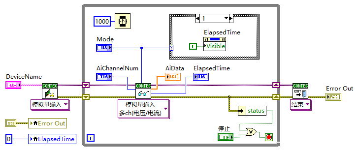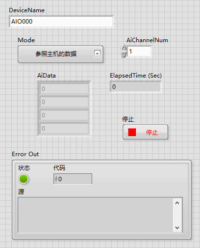 执行时,可以对在“ AiChannelNum”中指定的通道数进行模拟输入, 并检查输入电压(或电流)值。 在“Mode”下,可以选择“参照主机数据”或“参考子机数据”, 在“参照主机数据”的情况下, 自数据存储在主机以后的经过时间 显示在“ElapsedTime (Sec)”中。