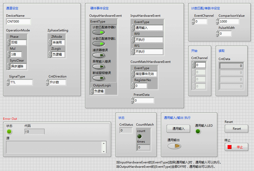 在此示例中,硬件事件设定,状态和通用输入/输出的通道号设定为[EventChannel]。