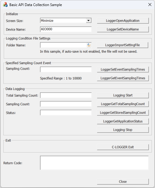 This sample program starts C-LOGGER and can start and stop single-channel and multi-channel data input.