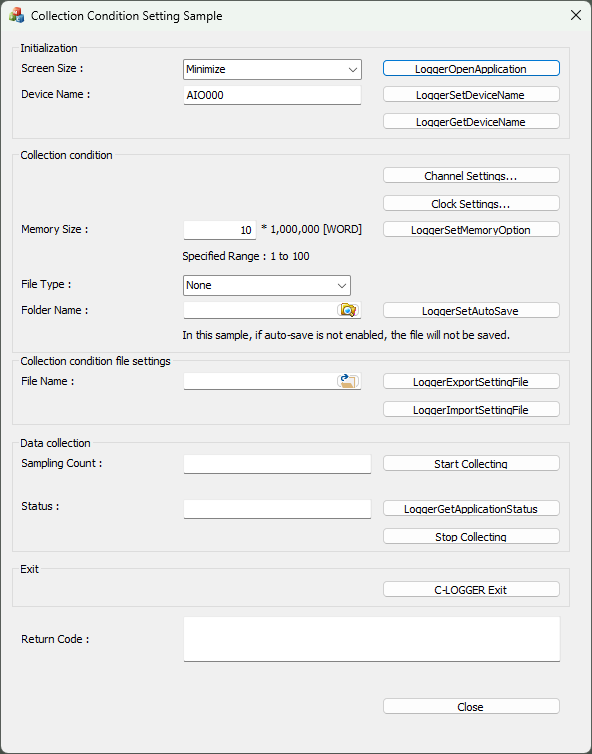 This sample program starts C-LOGGER and allows you to set detailed collection conditions and perform collection.