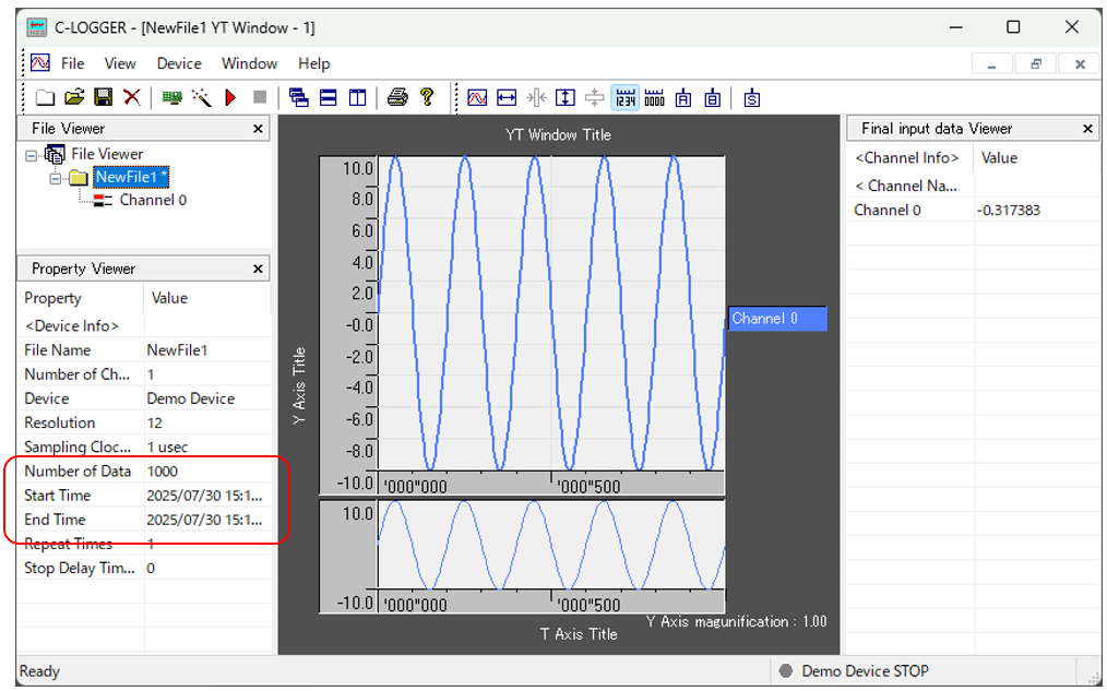When File Viewer Icon is selected in the file viewer, Number of Data, Start Time, and End Time in Property Viewer are updated.