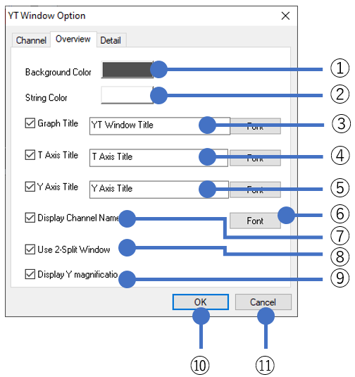 Set the font used for the Graph Title, T Axis Title, Y Axis Title, and Channel Name, respectively. |