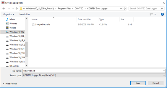 Select Binary form [CONTEC Logger Binary Data (*.clb)] or CSV form [CONTEC Logger Text Data (*.csv)] on file type.