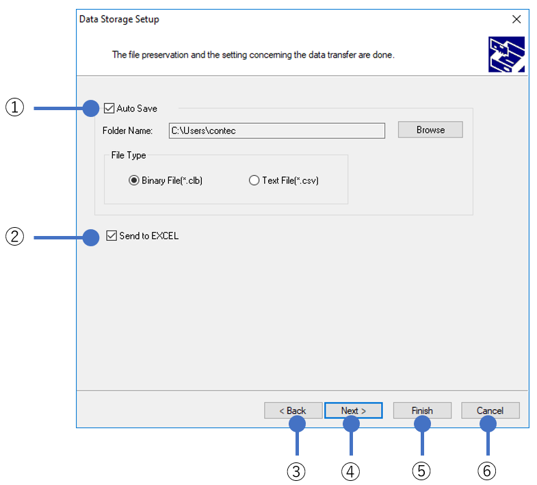 In Data Storage Setup page, perform settings for saving acquired data automatically and whether send data to Excel.