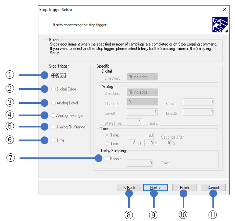 If the "Sampling Times" is "Number of times", acquisition will stop when the set number of samplings is completed or the Stop Logging command is executed. If the "Sampling Times" is "Infinity", acquisition will be performed until the Stop Logging command is executed. |