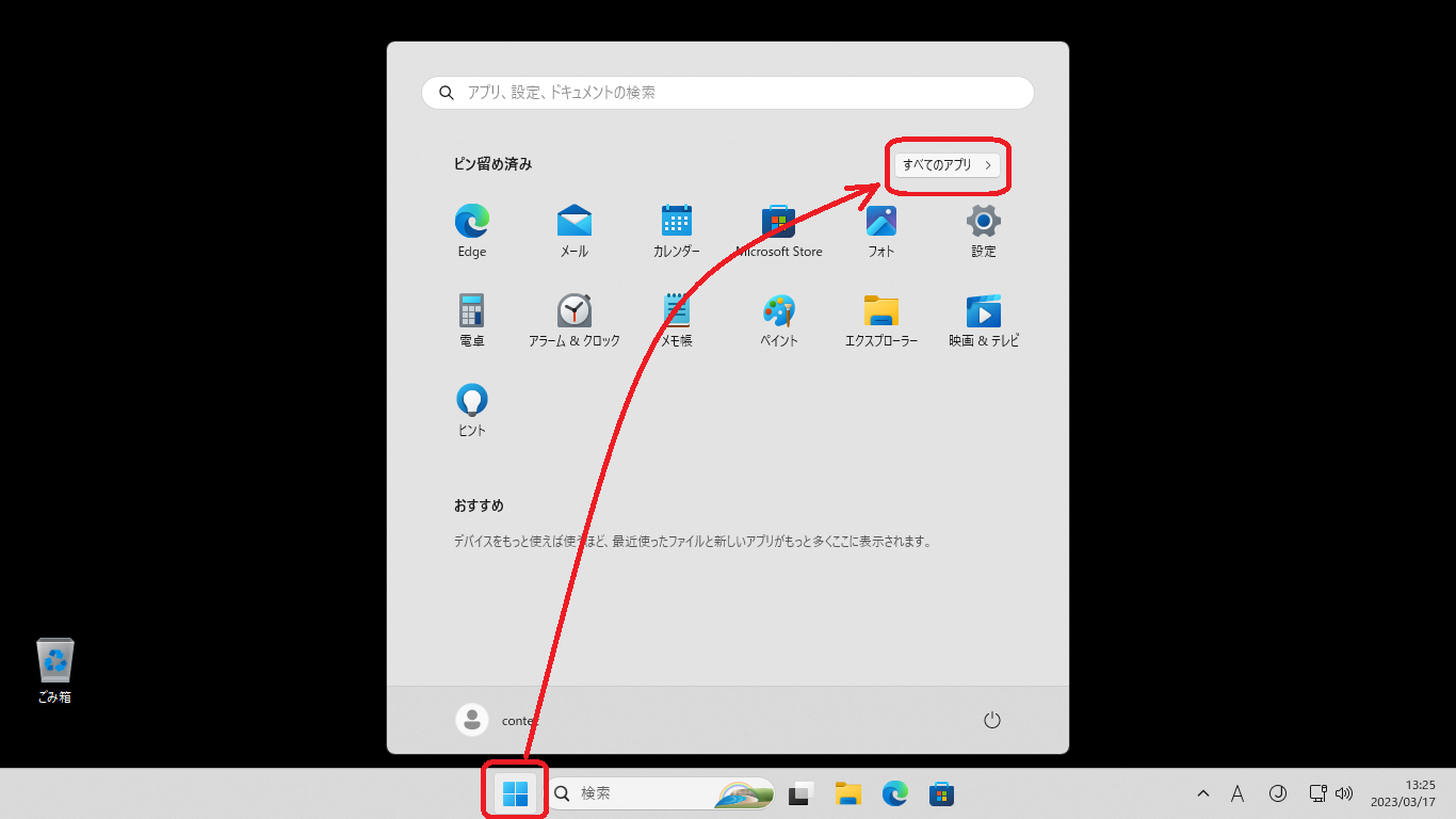 1.スタートメニューを選択し「すべてのアプリ >」を選択します。