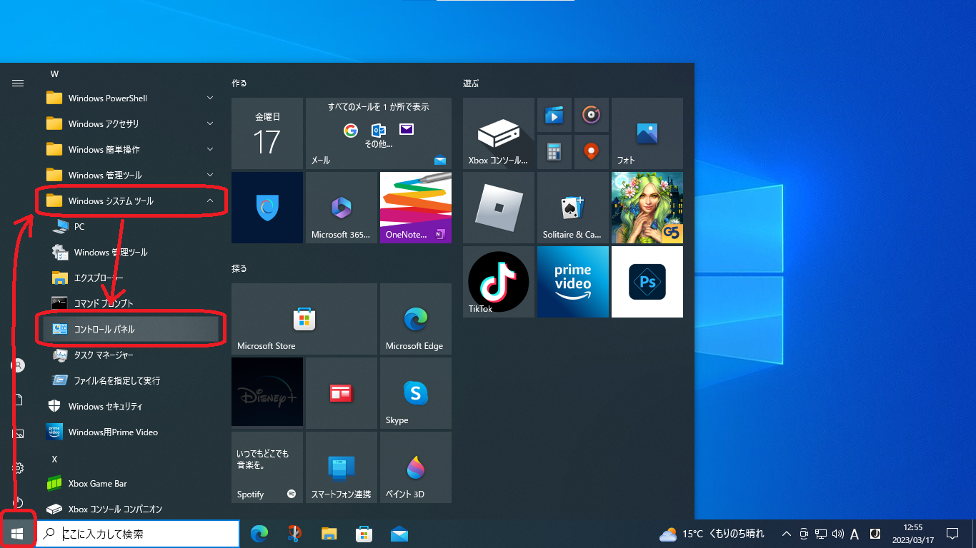 1.スタートメニューの「Windows システム ツール」内に、「コントロールパネル」があります。