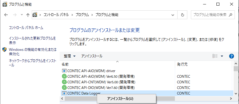 C-LOGGER Ver.1.90以前の場合、Windows OSのコントロールパネル内の「プログラムと機能」からアンインストールができます。
