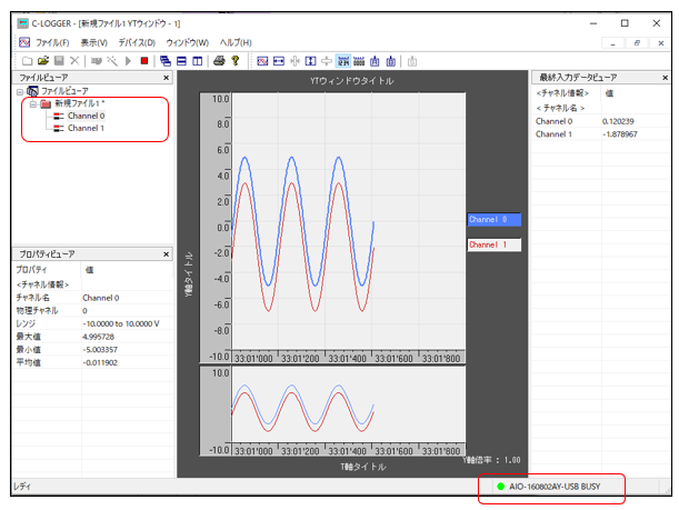 収集中は、ファイルビューア内のファイルアイコンが赤く変化し、画面右下のステータスバーに表示されている円形のアイコンが緑色に変化します。 各チャネルの収集データは、YTウィンドウ内にグラフ表示されます。