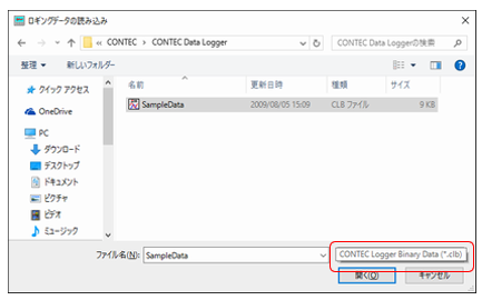 収集データファイルを読み込むには、メニューバーの「ファイル(F)」-「開く(O)」を選択します。 ファイル読み込みダイアログが表示されるので、ファイルの種類から、バイナリ形式「CONTEC Logger Binary Data (*.clb)」を選択してファイルを読み込みます。