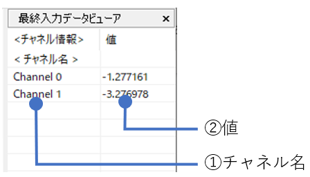 最終入力データビューアは、収集データを数値で観測するためのウィンドウです。 収集終了後の場合、最後に取得したデータが表示されます。
