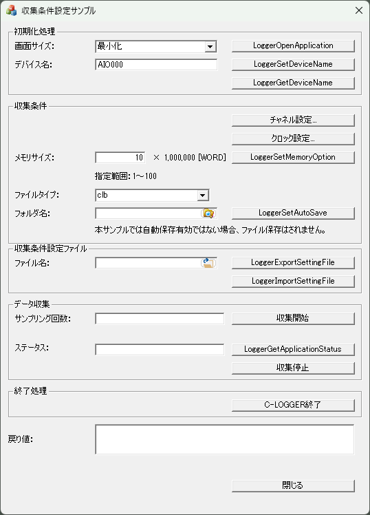 このサンプルプログラムは、C-LOGGERの起動させ、収集条件の詳細設定と収集ができます。