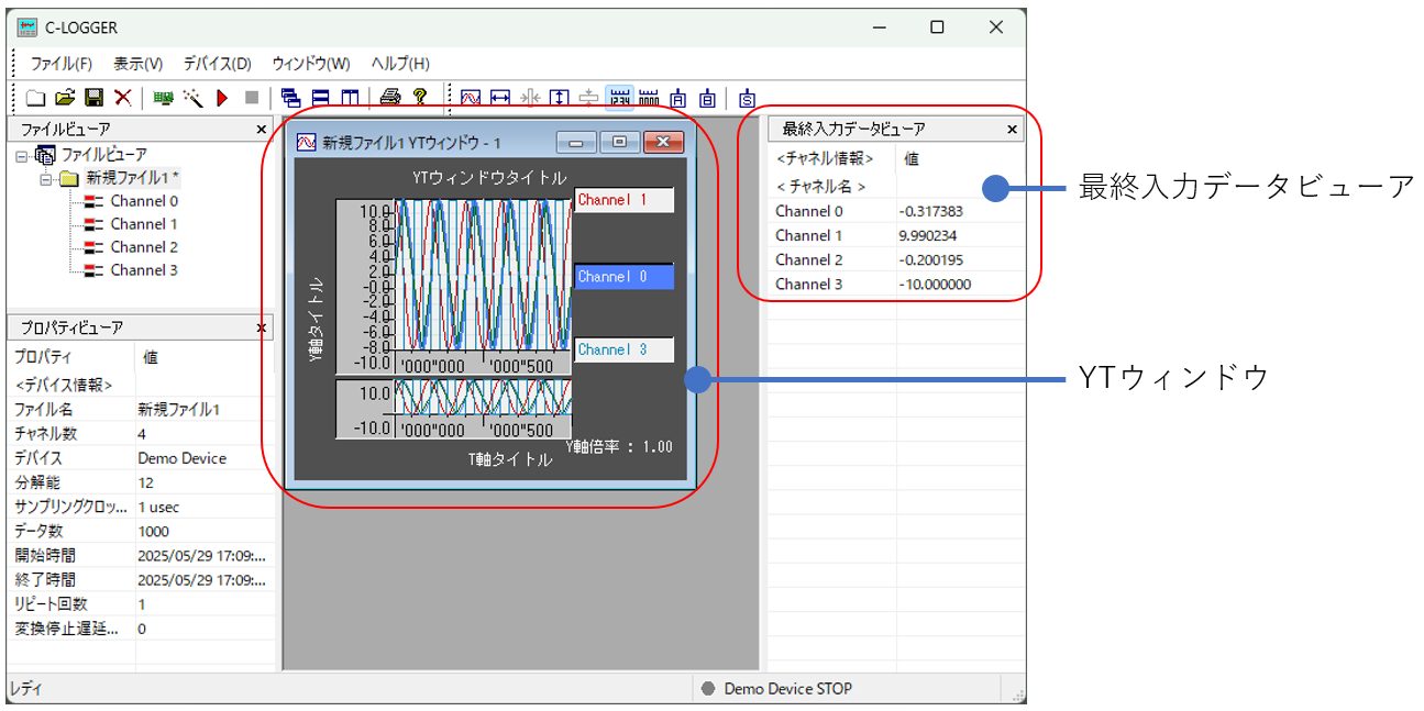 YTウィンドウ、および、最終入力データビューアの基本的な使い方に関しては、[基本操作] - [データを観測する]トピックを参照してください。