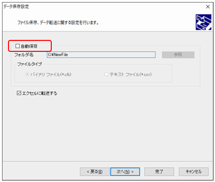 収集条件の設定のウィザード内に、「データ保存設定」があります。 この「データ保存設定」画面で、「自動保存」項目にチェックを入れると、データ収集後またはデータ収集中に自動保存が行われます。